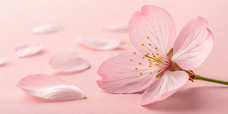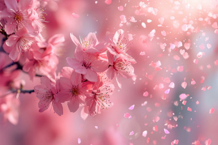 Cherry blossom petals drifting down against a soft pink background, symbolizing beauty and tranquility
