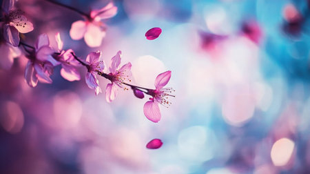 Captivating image of cherry blossom petals gently falling from a branch against a dreamy blue and pink bokeh background, evoking tranquility and beauty.