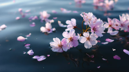 Delicate cherry blossoms float gracefully on calm water, creating serene and picturesque scene. soft pink petals contrast beautifully with deep blue surface, evoking sense of tranquility