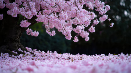 A cherry blossom tree in full bloom with delicate pink flowers and petals covering ground