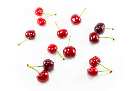 Ripe juicy cherries berries background. Overhead view, flat lay