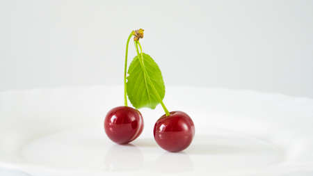large ripe cherry berries on a white background with water drops green leaf and branch close-up