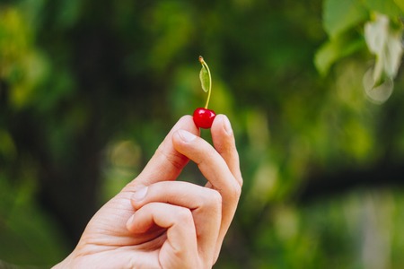 a man's hand is holding a freshly picked ripe fruit of a red sweet cherry with sprigs and a vinelet on a background of grass. close-up. summer. on blurred background