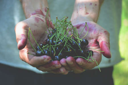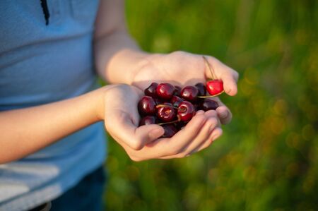 cherry. Farmers hands with freshly harvested sweet cherries. Fresh organic berries.
