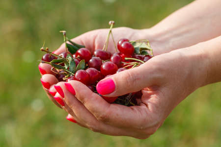 Fresh organic cherry berries in womans hands. Agriculture or harvest concept. Healthy vegan food. close up
