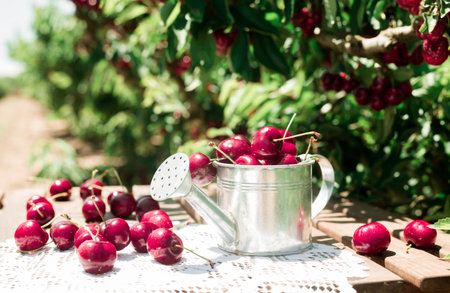 ripe juicy cherry berry in small tin can on lace napkin on table in cherry garden