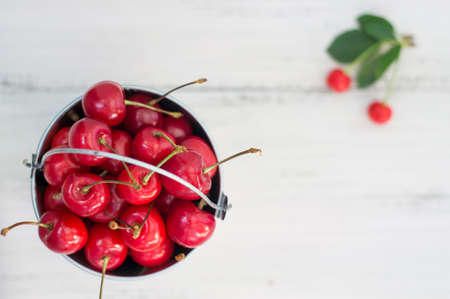 Fresh ripe cherries on the white wooden background. Copy, empty space for text.