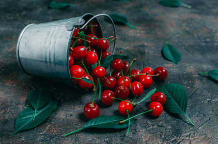 Cherry fell from a small bucket to the old, rustic concrete floor.Bright and ripe berry with green foliage.