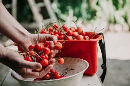 We are sorting out the harvest. Hands of a woman picking a ripe red cherry from a red container