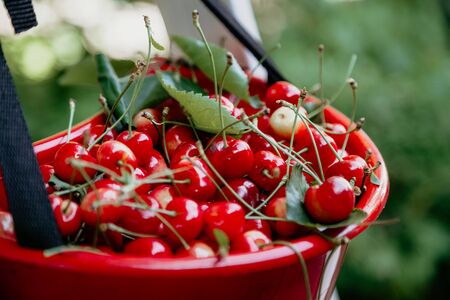 Collecting red sweet cherries. The red container is full of ripe red cherries.