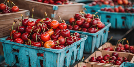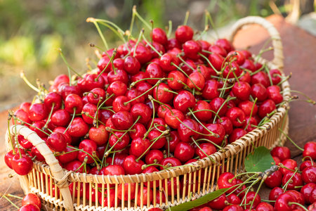 Detail of cherries picked in a rustic-looking wicker basket and bathed in warm summer light