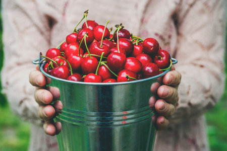 ripe juicy organic cherry berries close-up, harvesting of an agricultural plant of cherry or sweet cherry, manual berry picking, gardener worker