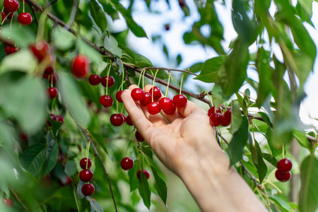 Woman's hand picking ripe red sweet cherries from a branch against a background of green leaves and sunlight in summer