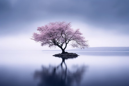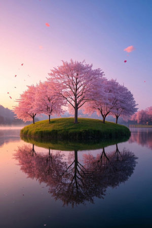 Solitary cherry blossom tree on small island at sunrise, serene landscape. Peace and tranquility concept