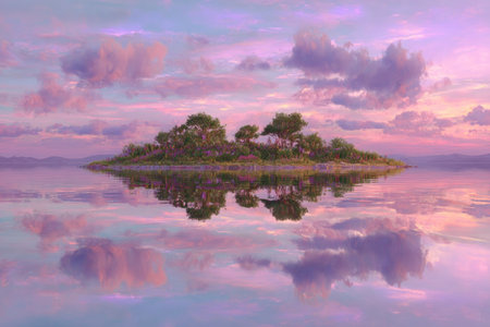 An island covered in trees sits calmly in reflective water under a sky filled with pastel colors. The scene showcases a serene landscape with mirrored reflections and soft lighting. This image may be suitable for travel, tourism, or environmental themes in various commercial and editorial applications.
