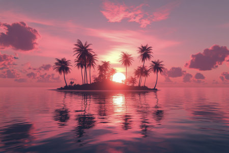 A vibrant sunset illuminates a small tropical island surrounded by calm waters. Tall palm trees stand gracefully on the island, casting reflections in the shimmering sea as day transitions to night.