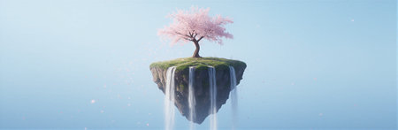 This enchanting image features a floating cherry blossom tree, surrounded by vibrant pink flowers and a serene blue sky. Perfect for nature themes.