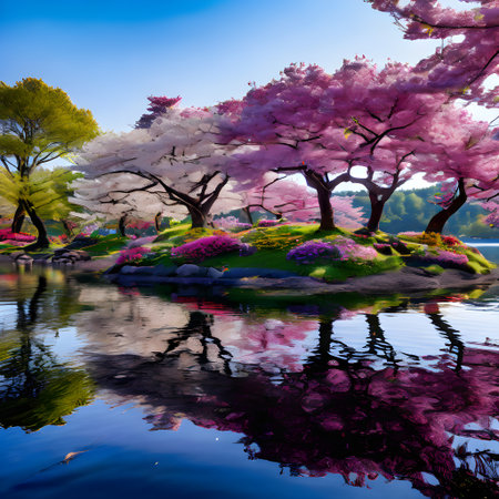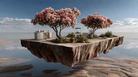 A surreal floating island showcases lush pink blooming trees, creating a tranquil outdoor space in a serene water reflection setting. Ideal for relaxation.