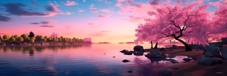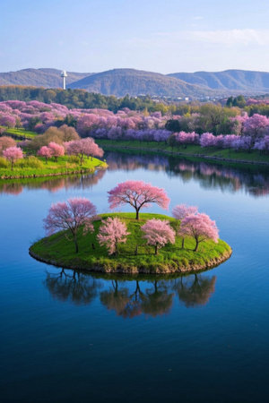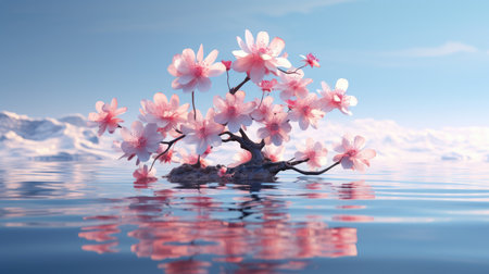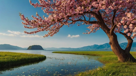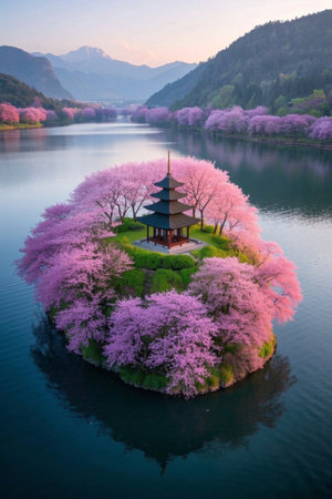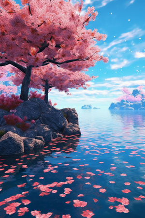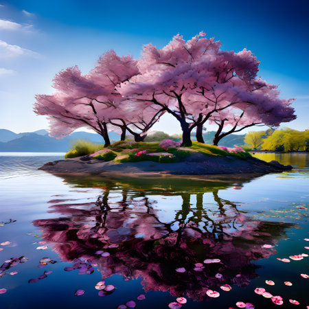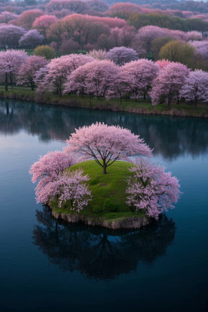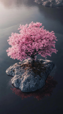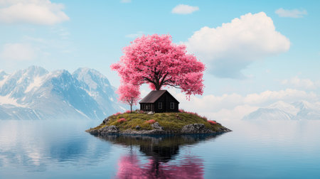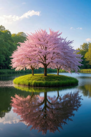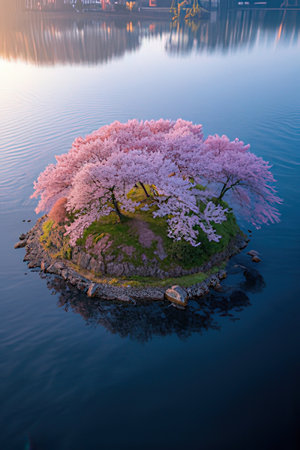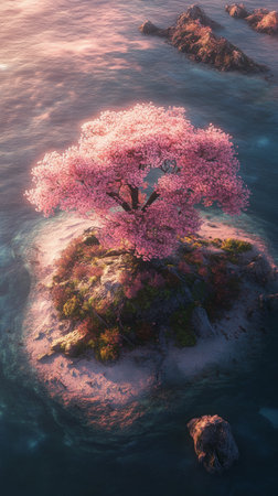Pink cherry blossom tree on a small island, serene nature scene. Tranquility and beauty concept