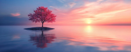 Solitary pink tree reflected in serene water at sunrise, peaceful landscape with soft pastel colors. Tranquility and nature concept