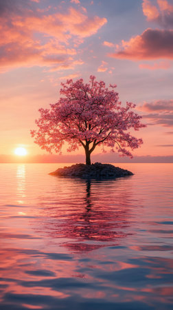 Isolated cherry blossom tree on small island in tranquil sea at sunset, serene and peaceful nature concept