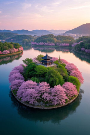 Cherry blossoms and ancient pavilion scenery on Lake Island