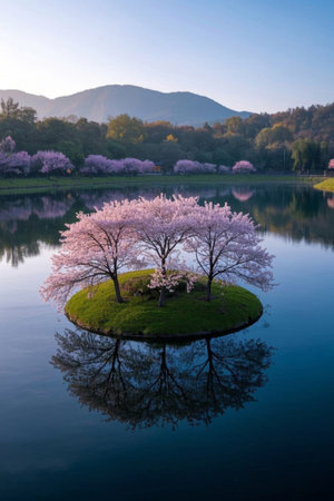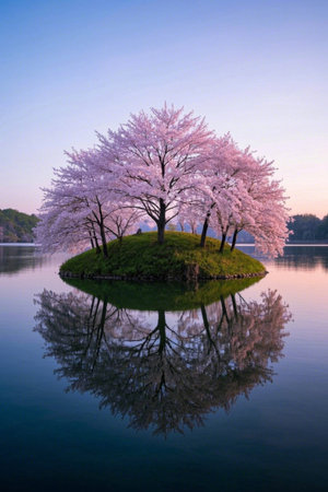 Solitary cherry blossom tree on island reflected in calm water at sunset, tranquil nature and serenity concept