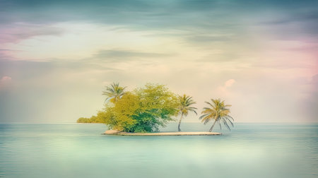 Discover a tranquil tropical island oasis, featuring vibrant palm trees and crystal-clear water surrounded by serenity, ideal for vacation and relaxation themes.