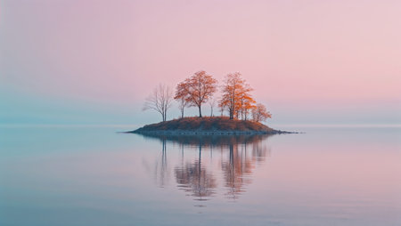 Tranquil scene of a small island with trees showing fall foliage reflected in still water under a pastel colored sky. Ai generated image