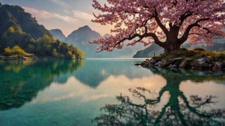 Beautiful spring landscape with cherry blossom tree and mountain lake.