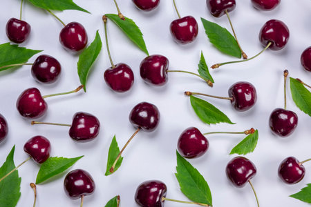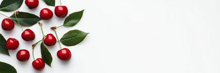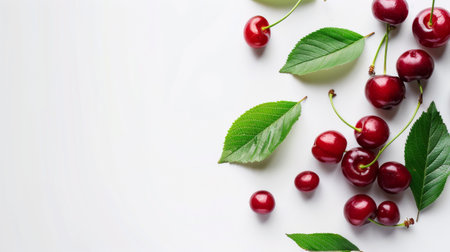 Freshly picked cherries with stems and leaves create a vibrant arrangement on a clean white backdrop, offering a healthy and delicious image with copy space