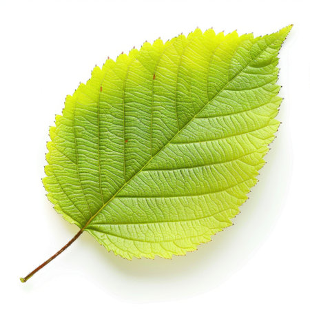 This image features a vibrant green leaf with intricate veins, showcasing its natural beauty and freshness against a clean white background. A perfect representation of nature.