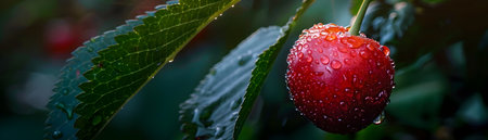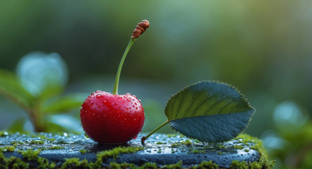 This captivating image showcases a single vibrant cherry fruit glistening with droplets of morning dew The deep red hue of the cherry is beautifully contrasted against the backdrop of rich verdant