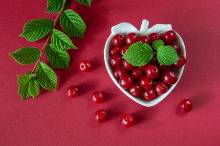 Juicy ripe felt cherries on a berry-shaped bowl on a burgundy red background