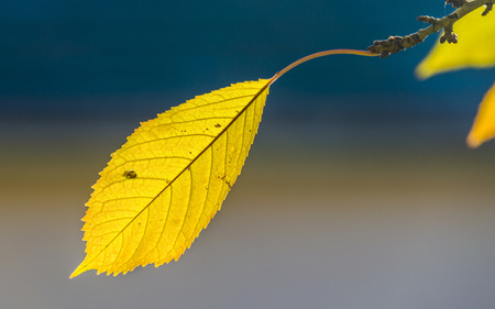cherry tree leaves under blue sky in harmonic yellow autumn colors