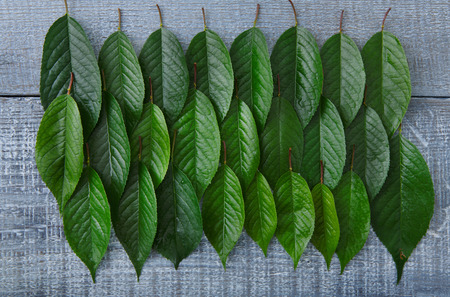 Green fresh leaves of cherry tree pattern background. Texture of leaf rows, abstract floral ornament of natural foliage at blue rustic wood. Wooden table with greenery, top view