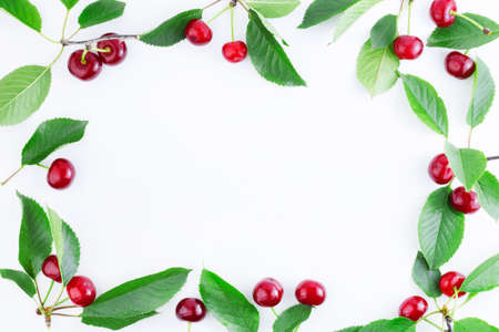 Frame of ripe cherries with leaves. Summer background. Ripe sweet cherries isolated on a white background. Copy space