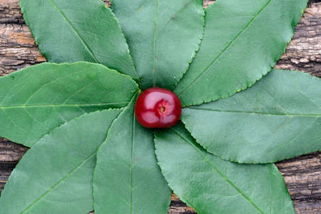 Heart shaped cherry berry on beautiful leaf isolated on white background