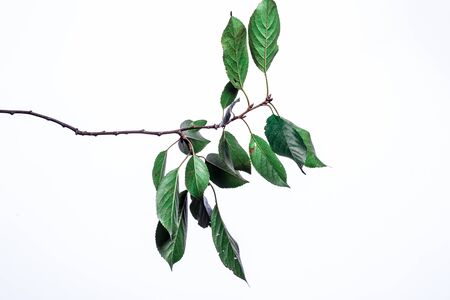 Leaves of a cherry tree on a branch. Isolated on white