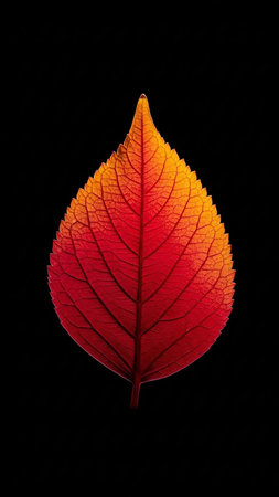 Stark showing a single vibrant red and orange leaf with visible veins illuminated from behind against a stark black background showcasing autumn colors keywords:...