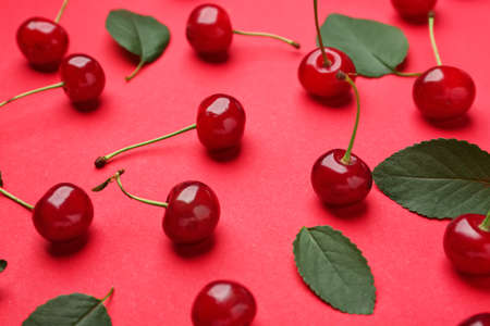Many ripe sweet cherry on color background