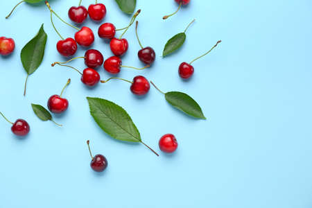 Fresh ripe cherry and leaf on green background, top view