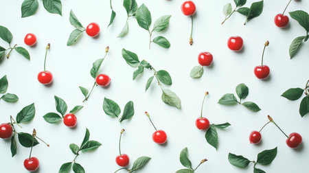 Red cherry and green leaves pattern on gray background, sweet cherry fruit pattern, overhead flat lay