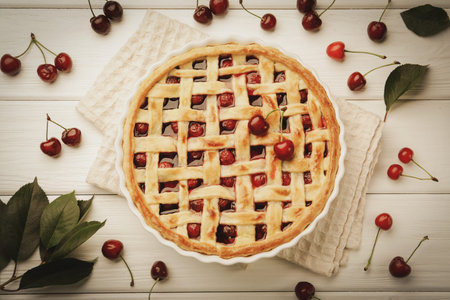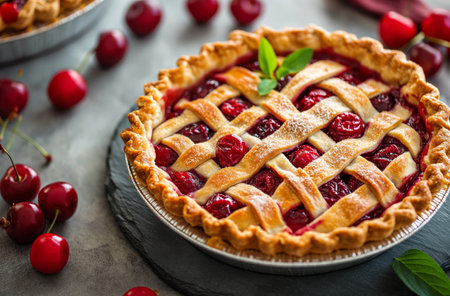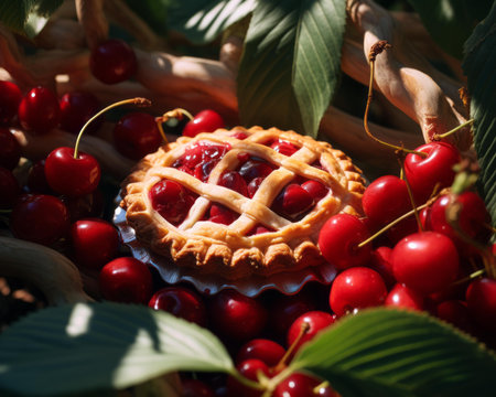 A vibrant cherry pie showcasing plump, red cherries atop a flaky crust, surrounded by fresh leaves. Perfect for dessert lovers and summer gatherings.