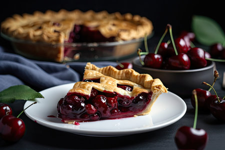cherry pie sitting on a black plate, with cherry filling and crust visible, created with generative ai