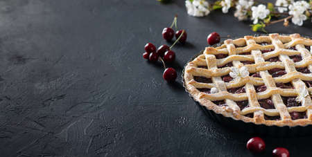 Cherry pie on black kitchen table, top view with copy space. Traditional homemade bakery.