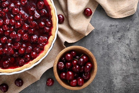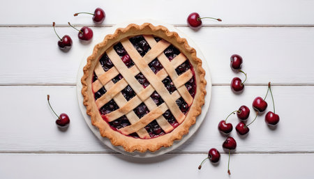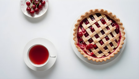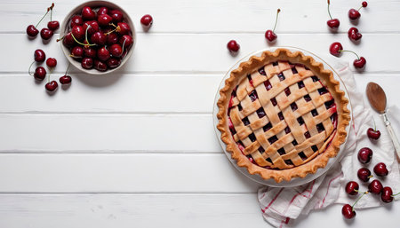Cherry pie on a white wooden background with place for text. Tart with a cherry. View from above. Layout