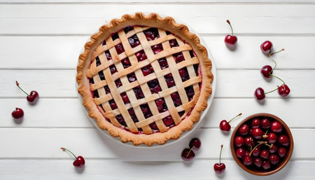 Cherry pie on a white wooden background with place for text. Tart with a cherry. View from above