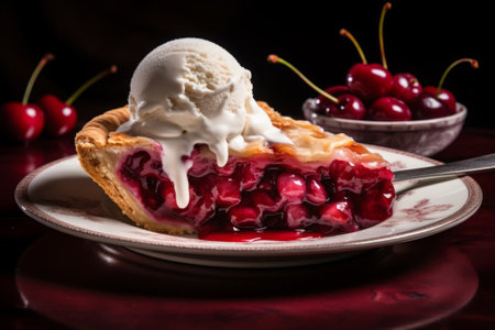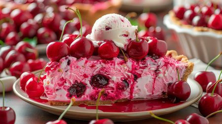 Delicious cherry desserts homemade cake with vanilla ice cream and slice of pie with melting scoop