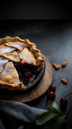 Fresh cherry pie with leaf garnishes on dark background, dusted powdered sugar